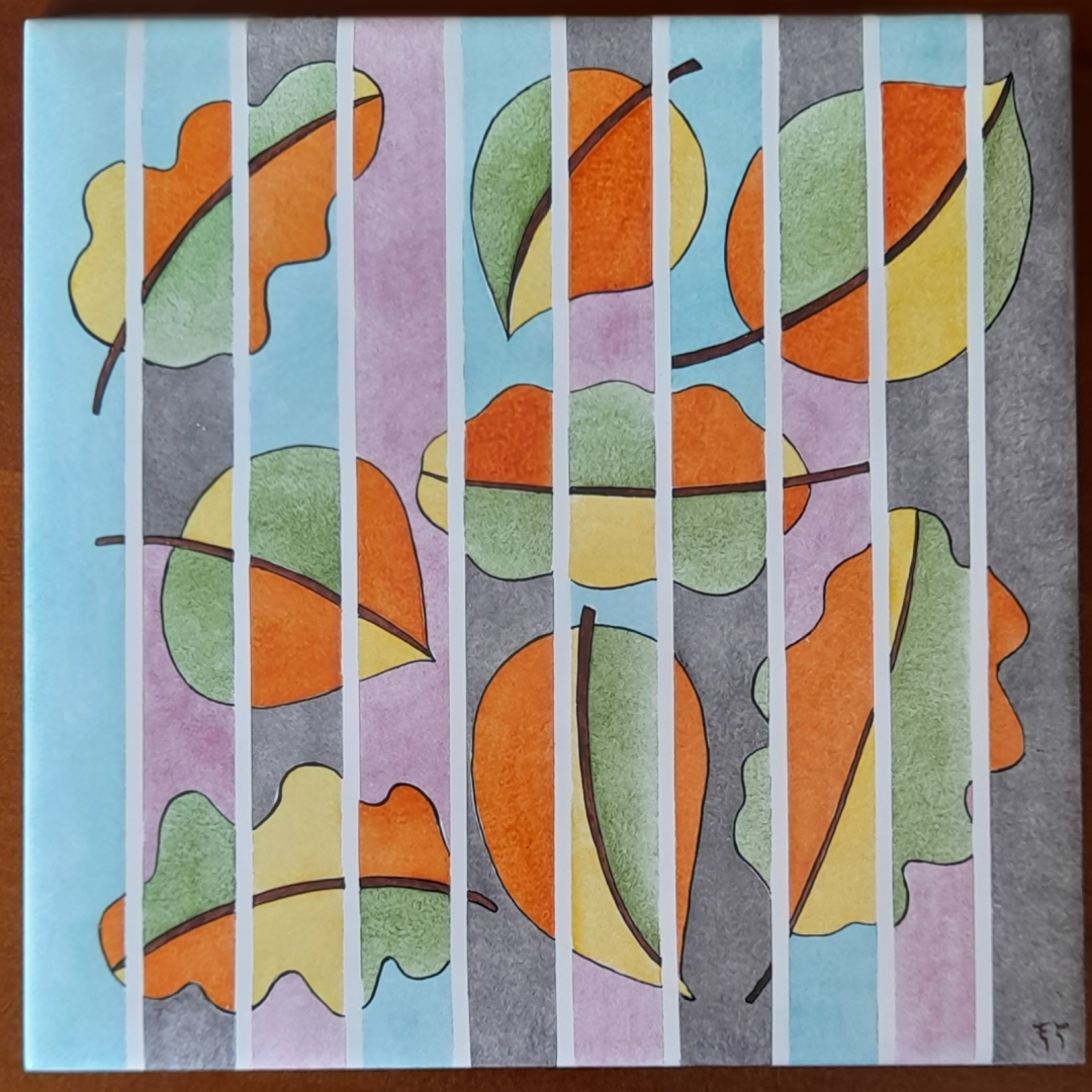 Carreau de céramique peint à la main représentant feuilles très colorées coupées par des bandes blanches.