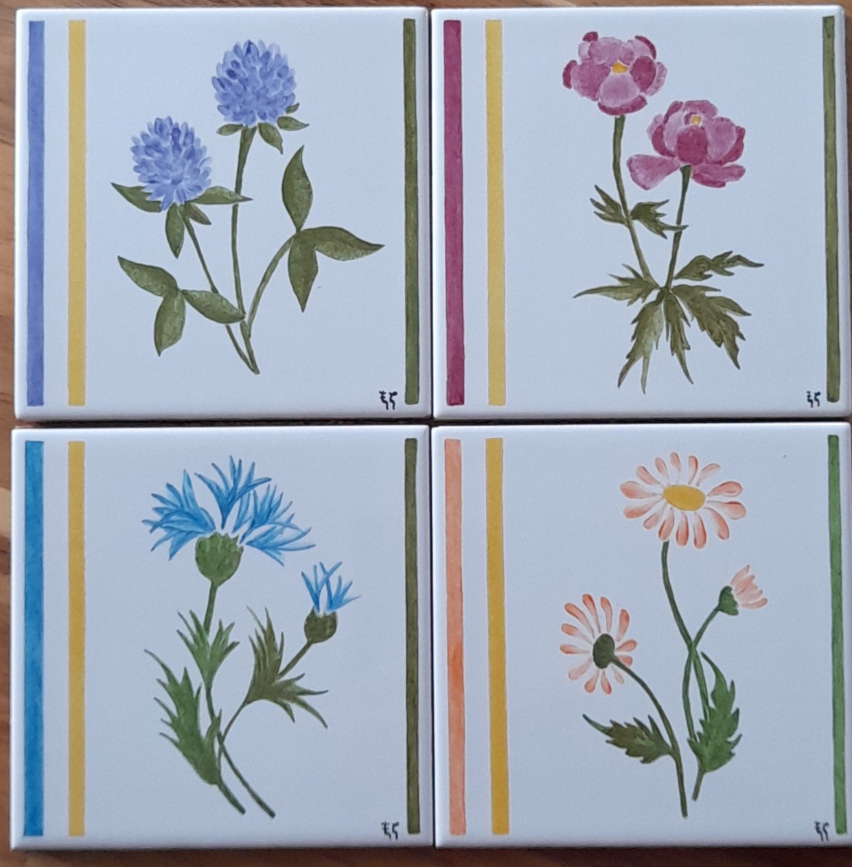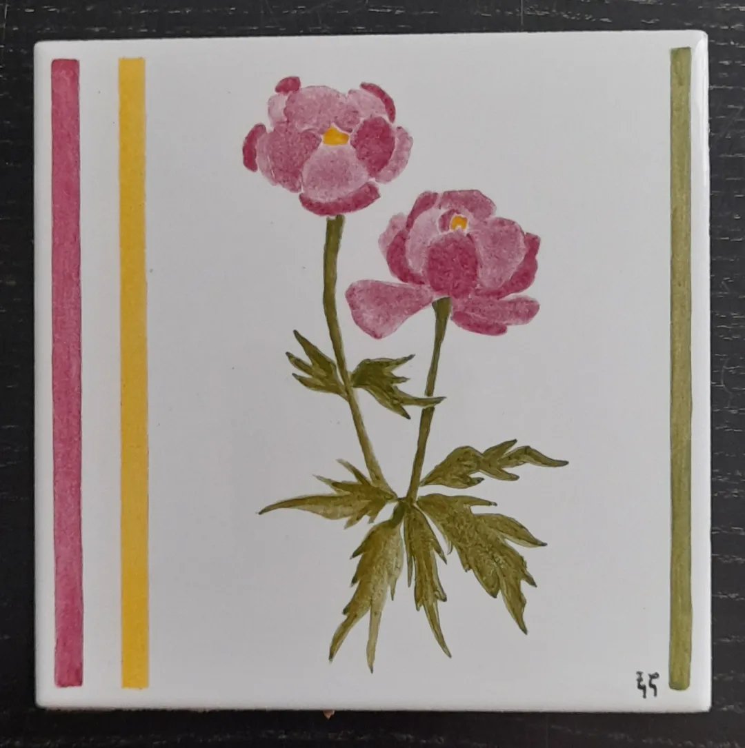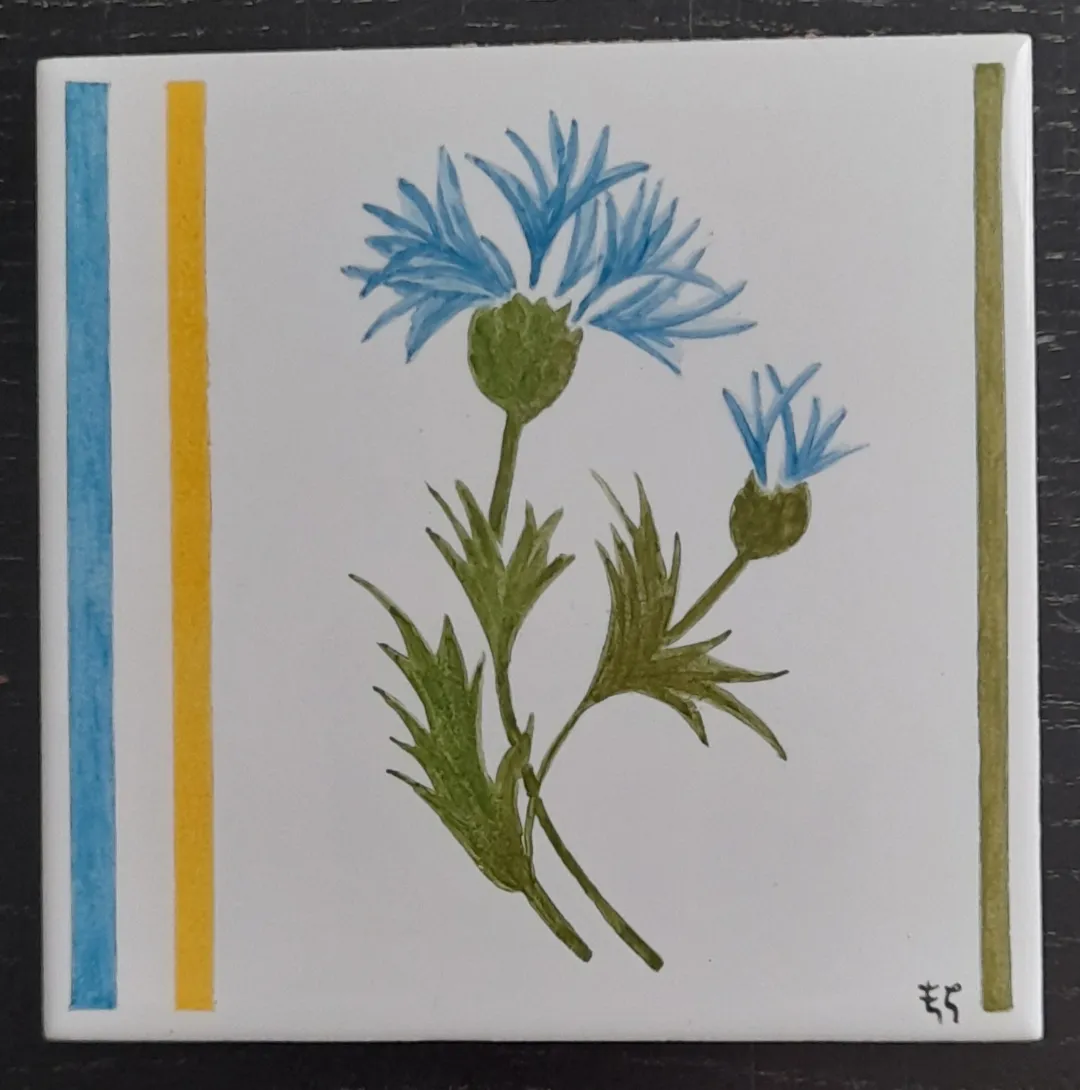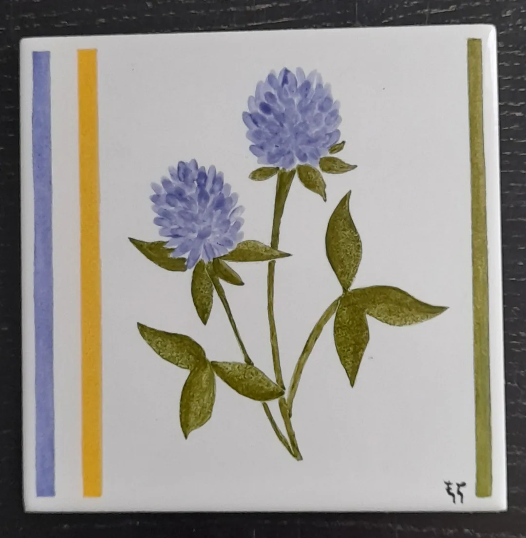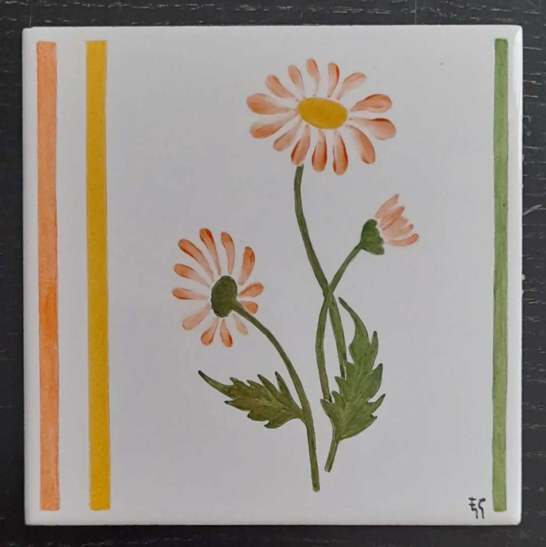 Carreau de céramique représentant des fleurs des champs. J’ai représenté des renoncules, des pâquerettes; des oeillets et du trèfle.