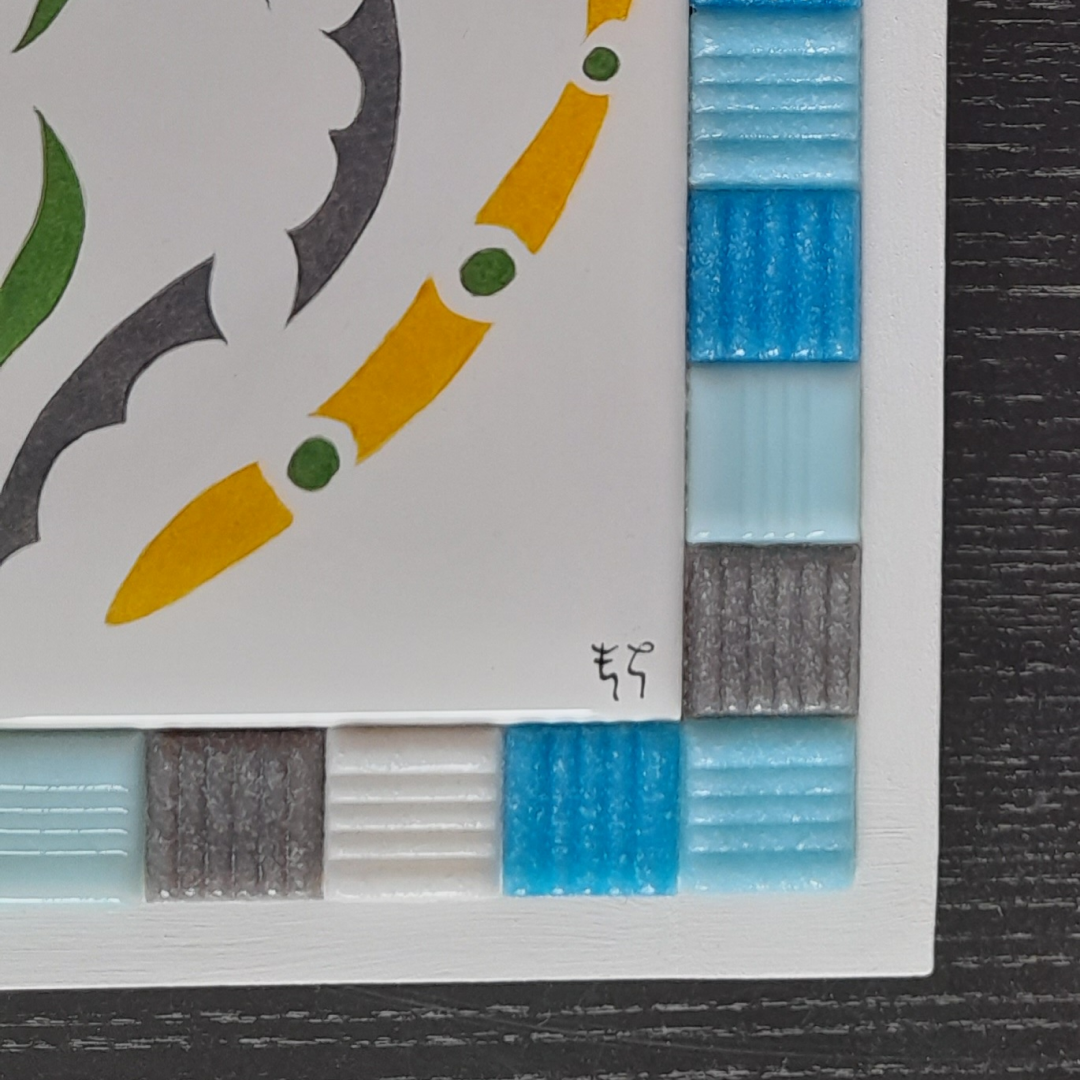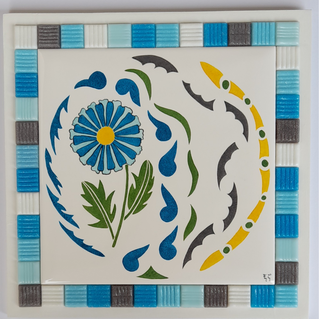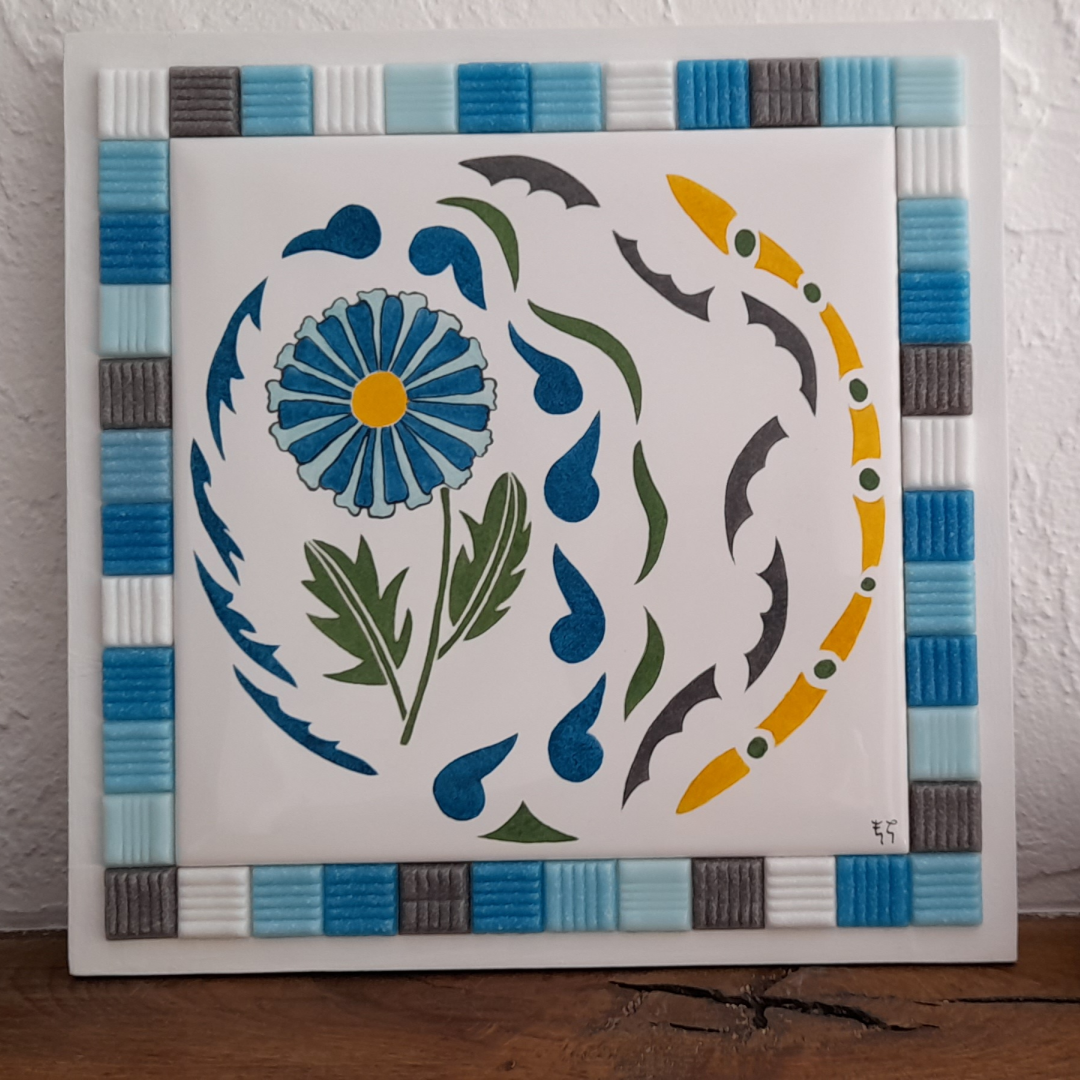 Sur le cadre, autour du carreau, j’ai collé des mosaïques en pâte de verre dans différentes teintes de bleu et de gris.