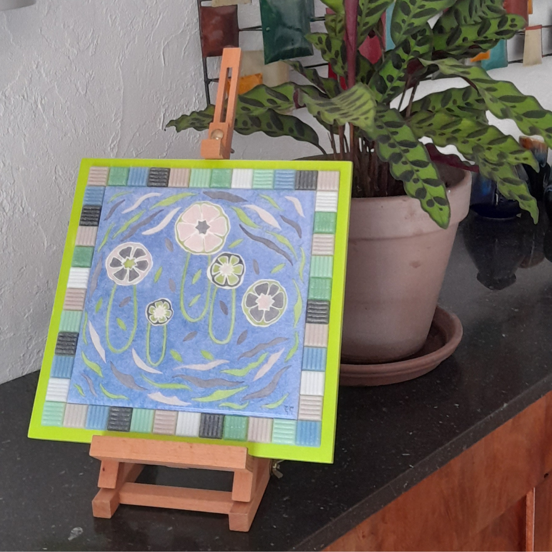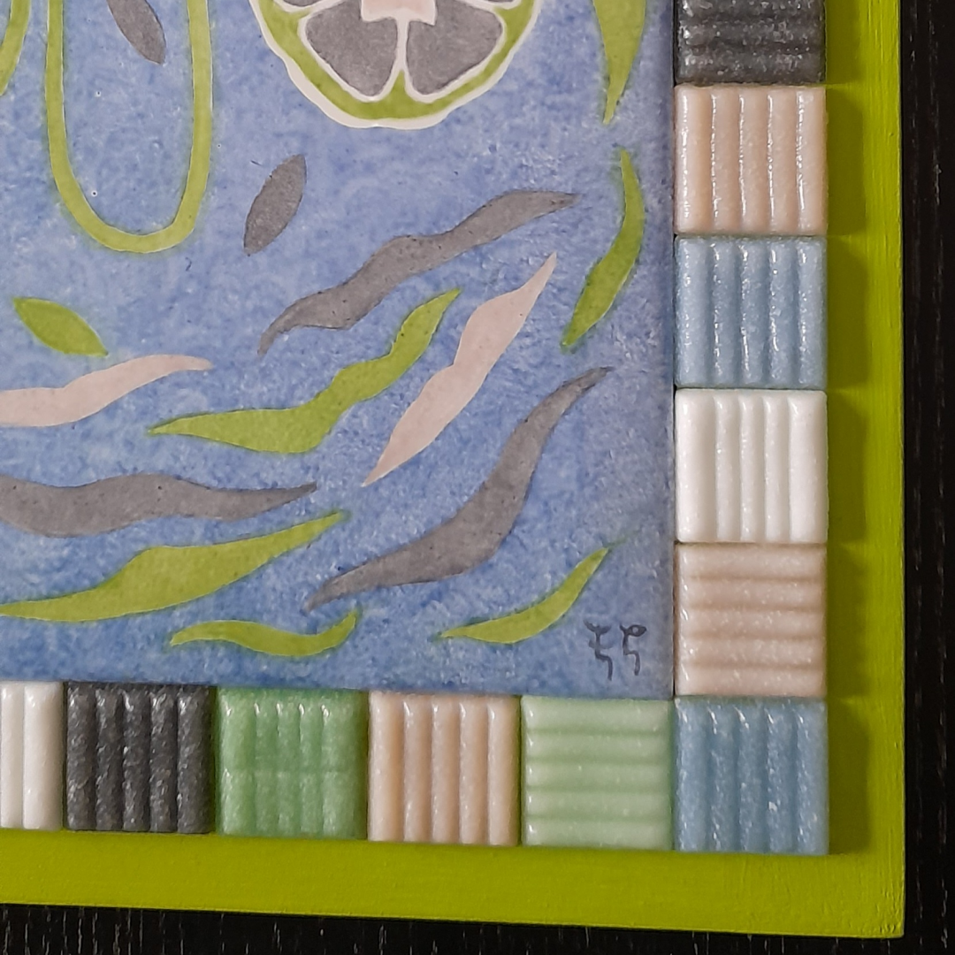 Sur le cadre, autour du carreau, j’ai collé des mosaïques en pâte de verre dans différentes teintes qui s’accordent avec les coloris du motif.