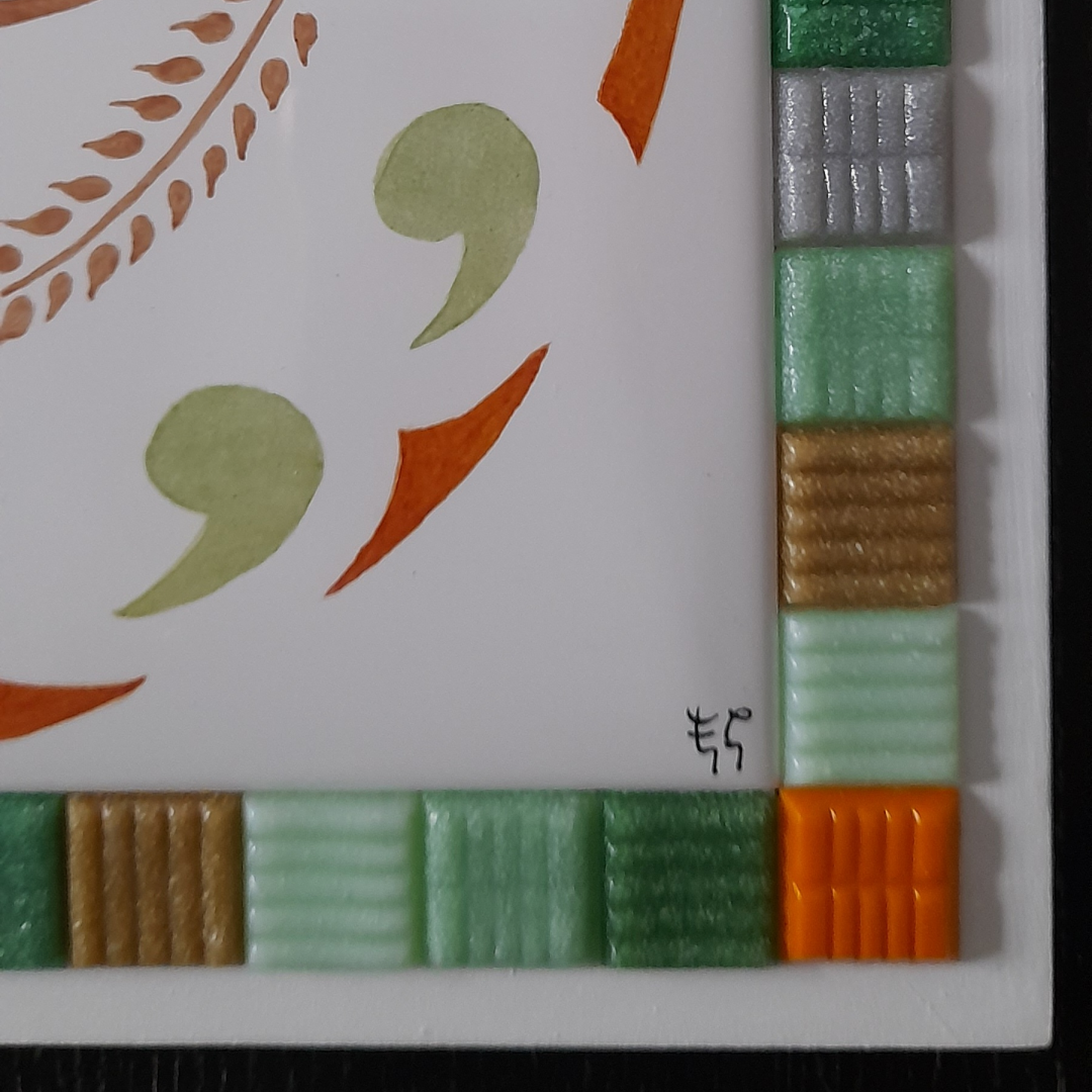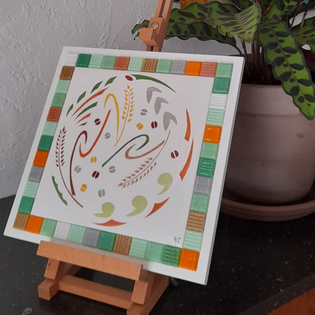 Sur le cadre, autour du carreau, j’ai collé des mosaïques en pâte de verre qui s’accordent avec le motif.
