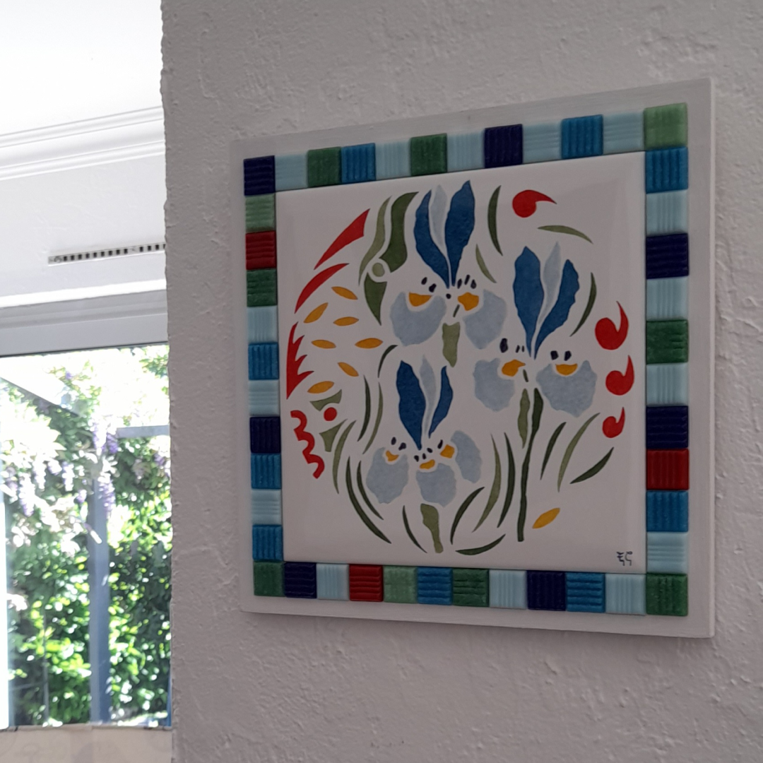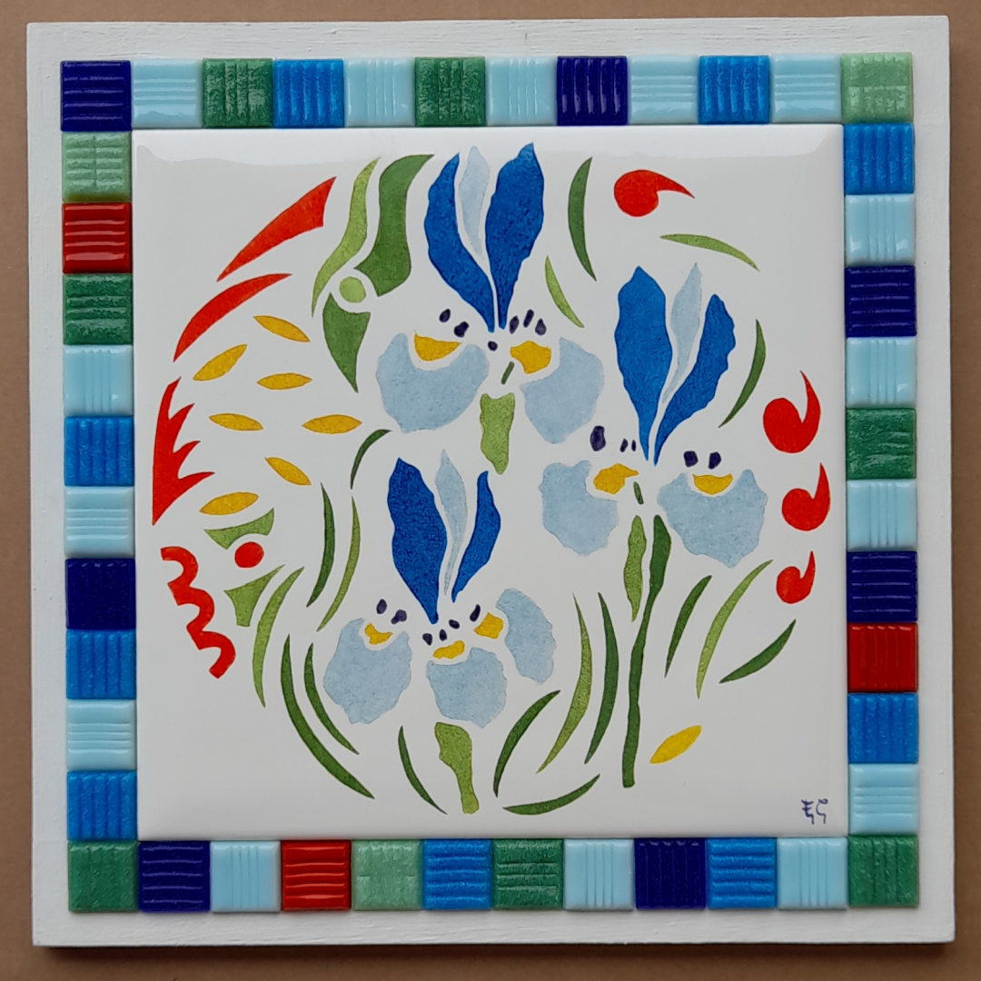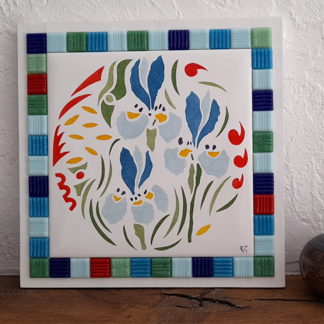 Carreau de céramique peint à la main, représentant des iris.