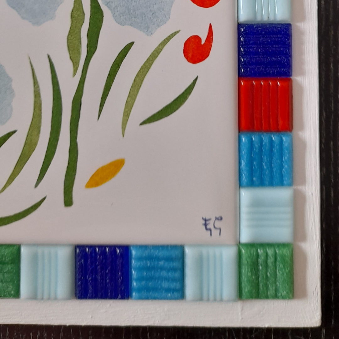 Sur le cadre, autour du carreau, j’ai collé des mosaïques en pâte de verre dans différentes teintes, en accord avec les couleurs du motif.