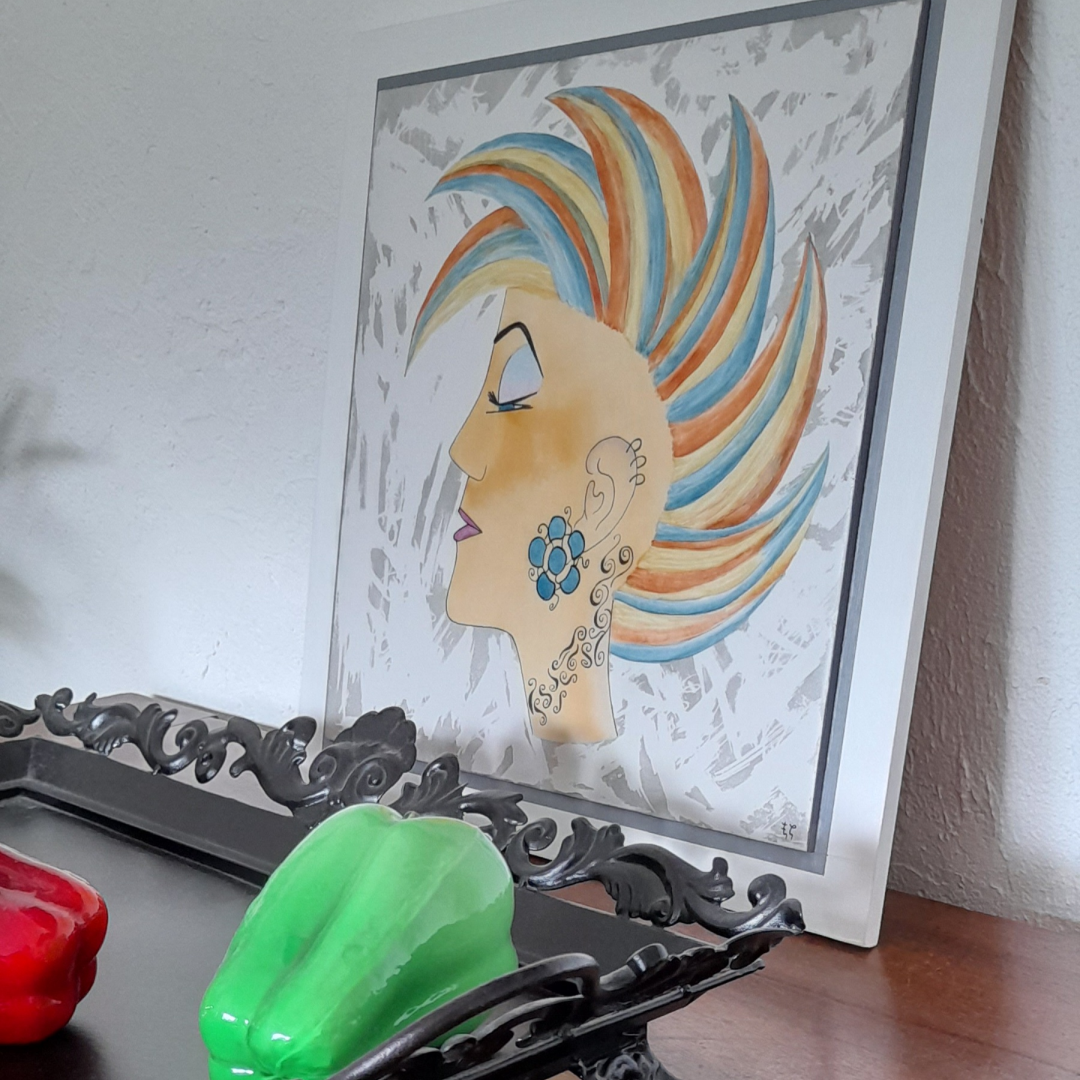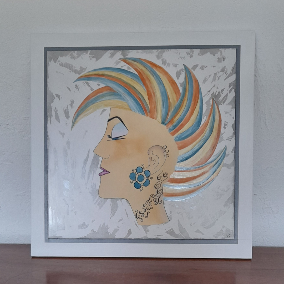 Les pigments utilisés sont dans les tons de bleu, de beige, de orange, de gris et de jaune.