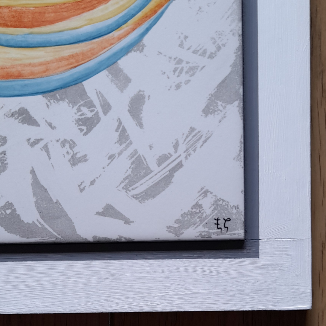 Carreau de céramique peint à la main représentant une création imaginaire, graphique.