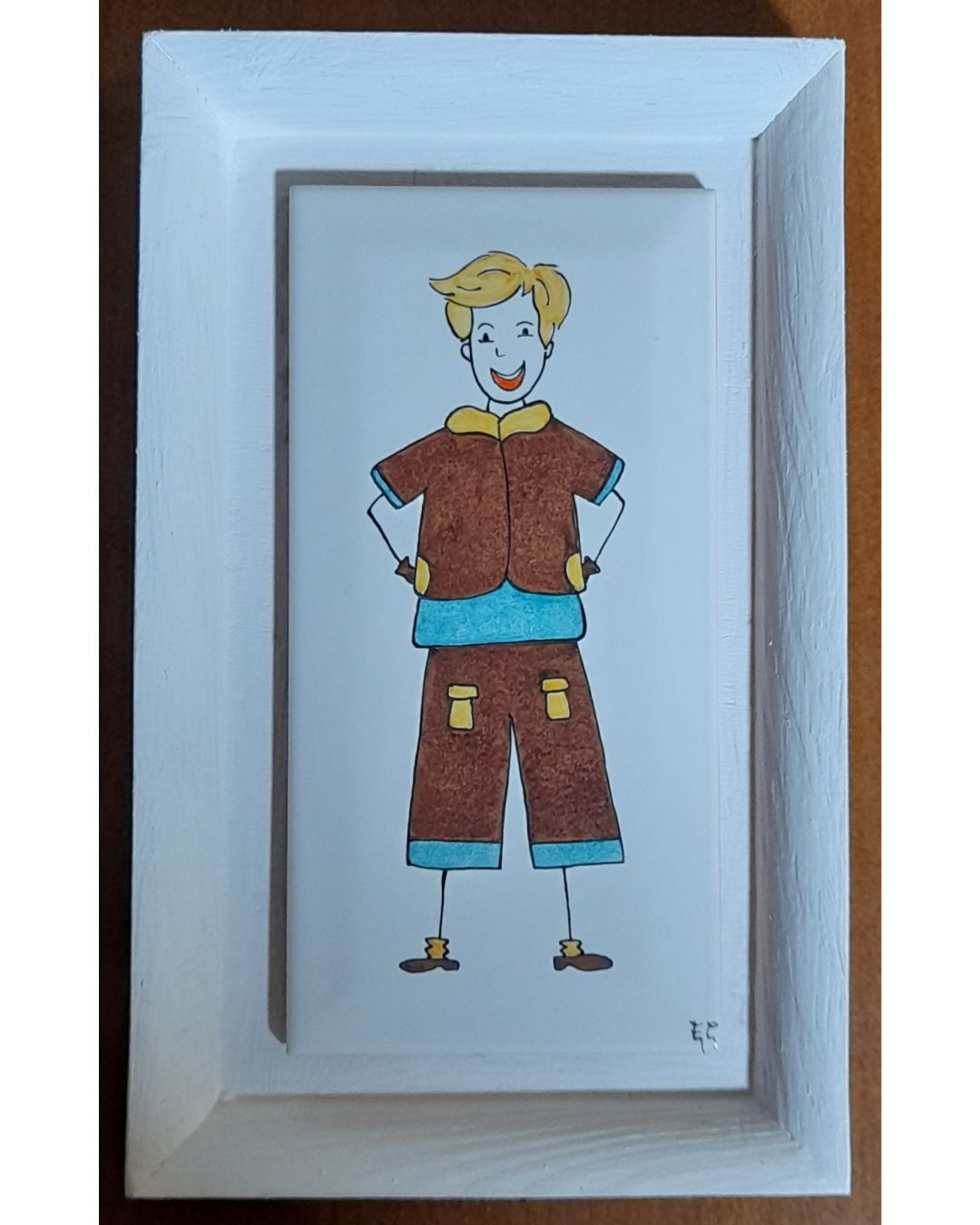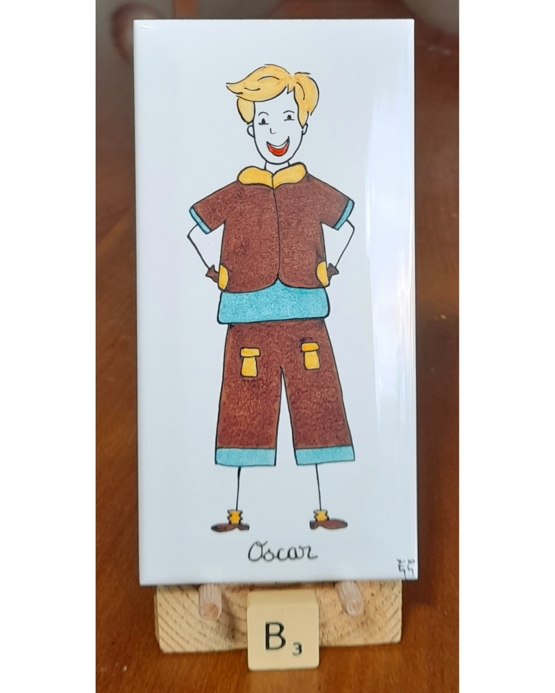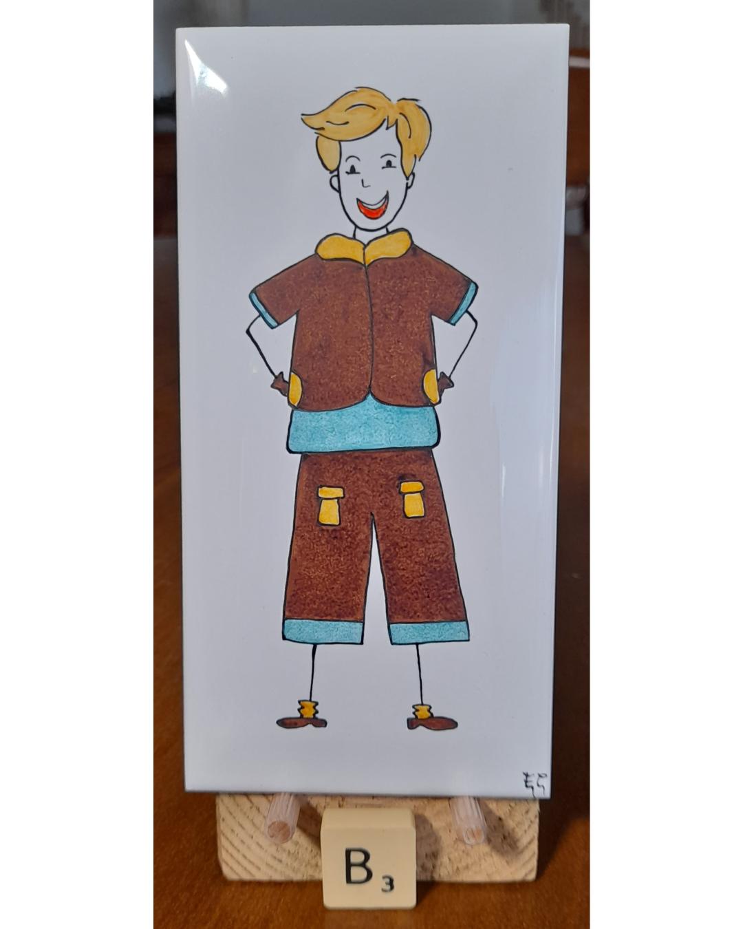Je peins des personnages stylisés, joyeux et colorés sur ces carreaux de forme rectangulaire .